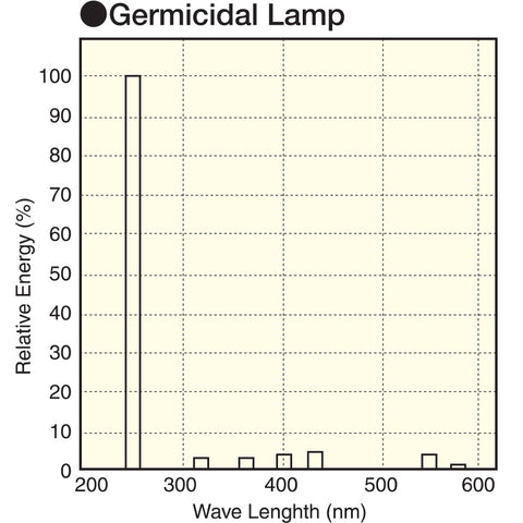 Germicidal lamps efficiently emit a large amount of ultraviolet radiation at 253.7nm, which provides an excellent germicidal power. These lamps have a similar structure and electrical operation to general fluorescent lamps used for general illumination. However, they use glass which transmits UV rays, with a strong peak at 253.7nm, and little visible light.